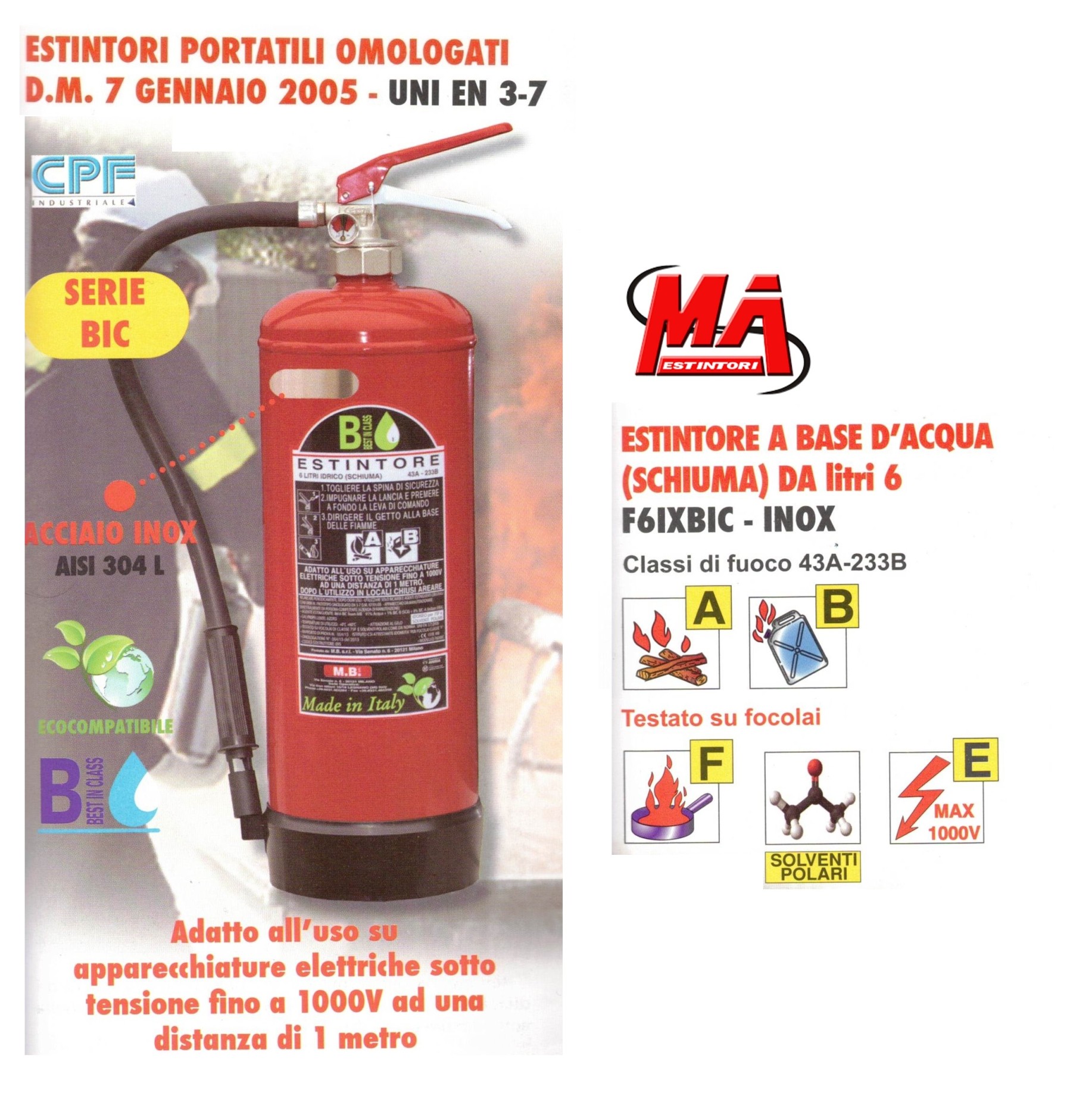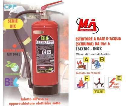 Estintore portatile omologato, a base d'acqua (schiuma) da 6 Litri